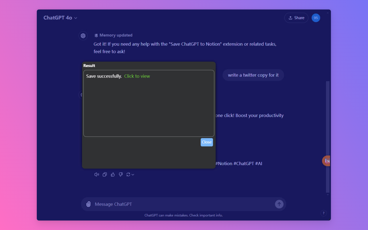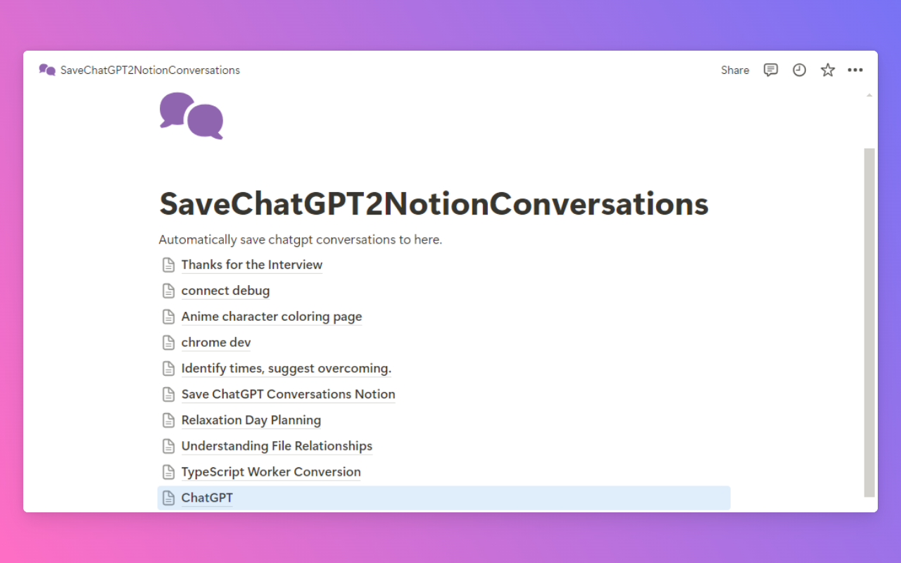 Batch Save ChatGPT to Notion is a tool that simplifies batch saving your ChatGPT conversations to Notion with just one click.