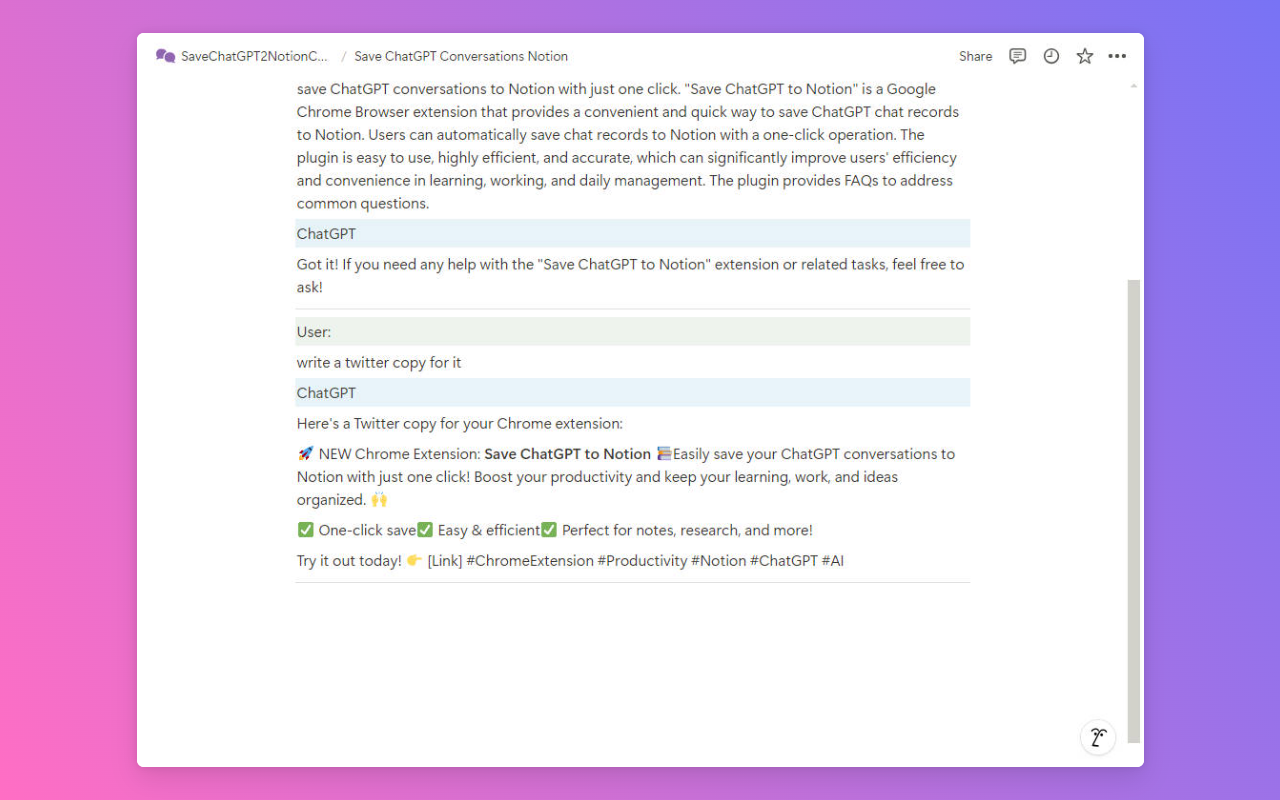 ChatGPT to Notion is a Chrome and Edge extension for saving ChatGPT conversations directly to Notion.